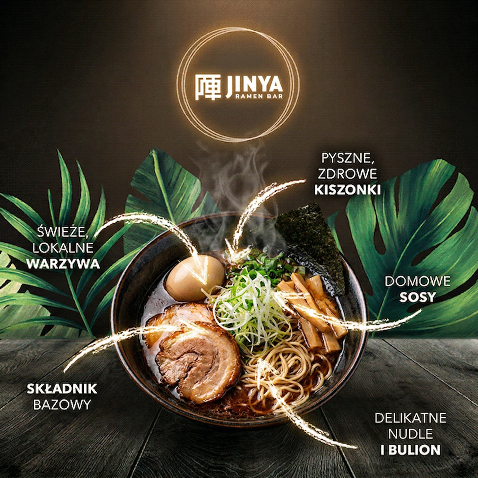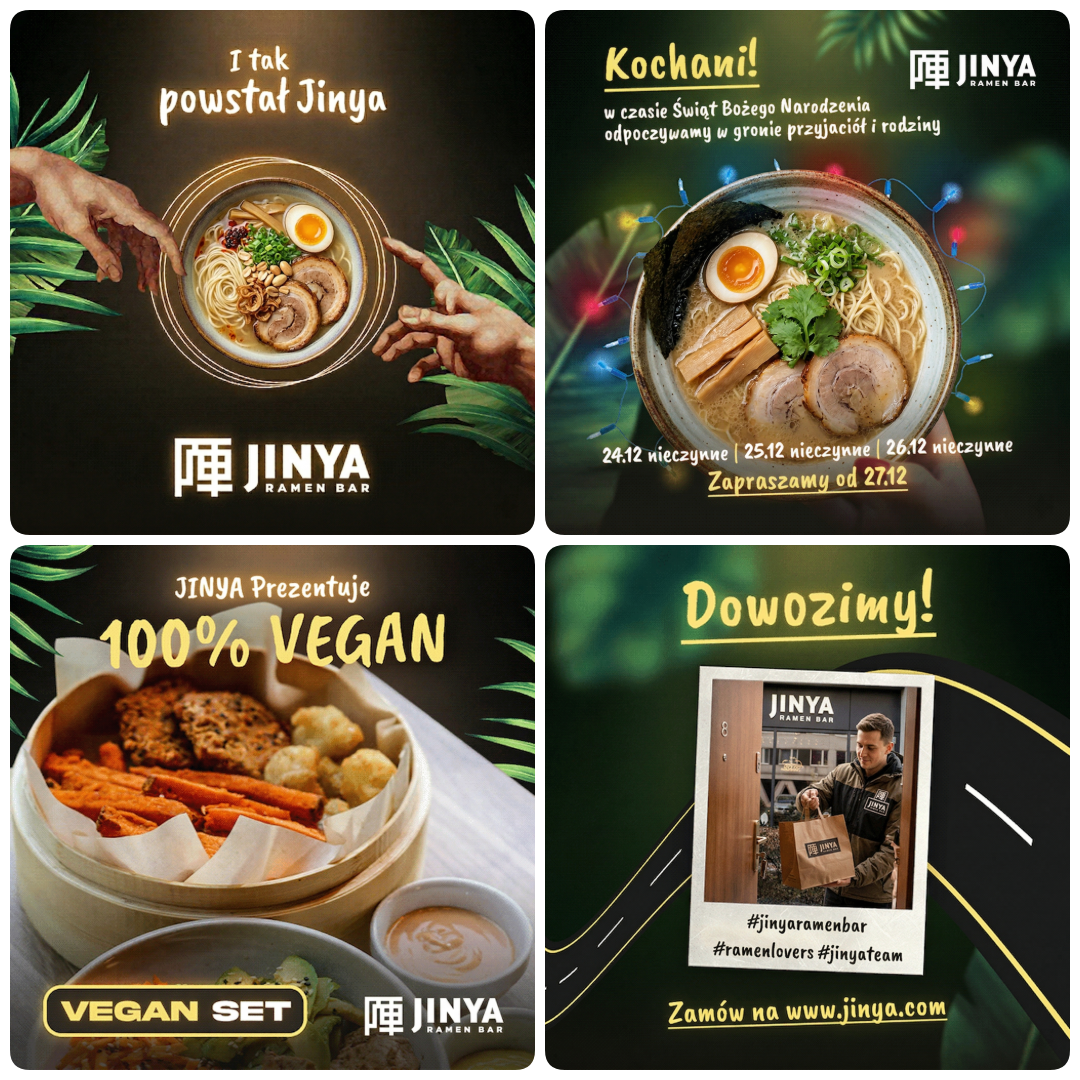 W ramach kompleksowego projektu rebrandingu i adaptacji wizualnej dla azjatyckiej restauracji Jinya Ramen Bar na rynku polskim, postawiliśmy na stworzenie spójnej i pociągającej wizji kulinarnych doświadczeń. Naszym zadaniem było zaprojektowanie unikatowych materiałów reklamowych, które w przystępny i angażujący sposób przekażą klientom wartości marki: autentyczność, jakość składników i nowoczesne podejście do tradycji. Skupiliśmy się na budowaniu ciepłej atmosfery i wyrazistych kompozycji dań, takich jak autorskie rameny i zestawy wegańskie, co pozwoliło stworzyć spójną narrację wizualną budującą więź z gośćmi.
